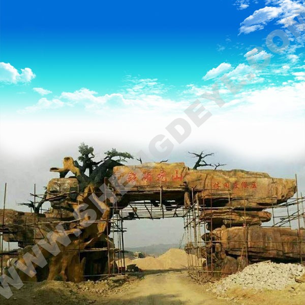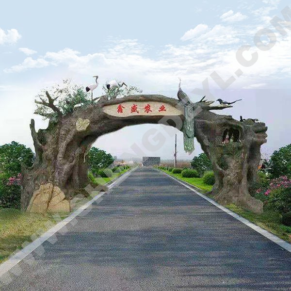 水泥仿真樹大門是仿真樹制作的較高境界,主要使用于公園景區、生態園入口、主題餐廳大門,農家樂等主題景觀的營造。水泥仿真樹大門同時借鑒了根雕工藝和雕塑工藝,仿真植物采用雕塑手法制作,仿真自然界中常見的植物造型,鑲嵌于大門景觀中,突出整體環境的格調。